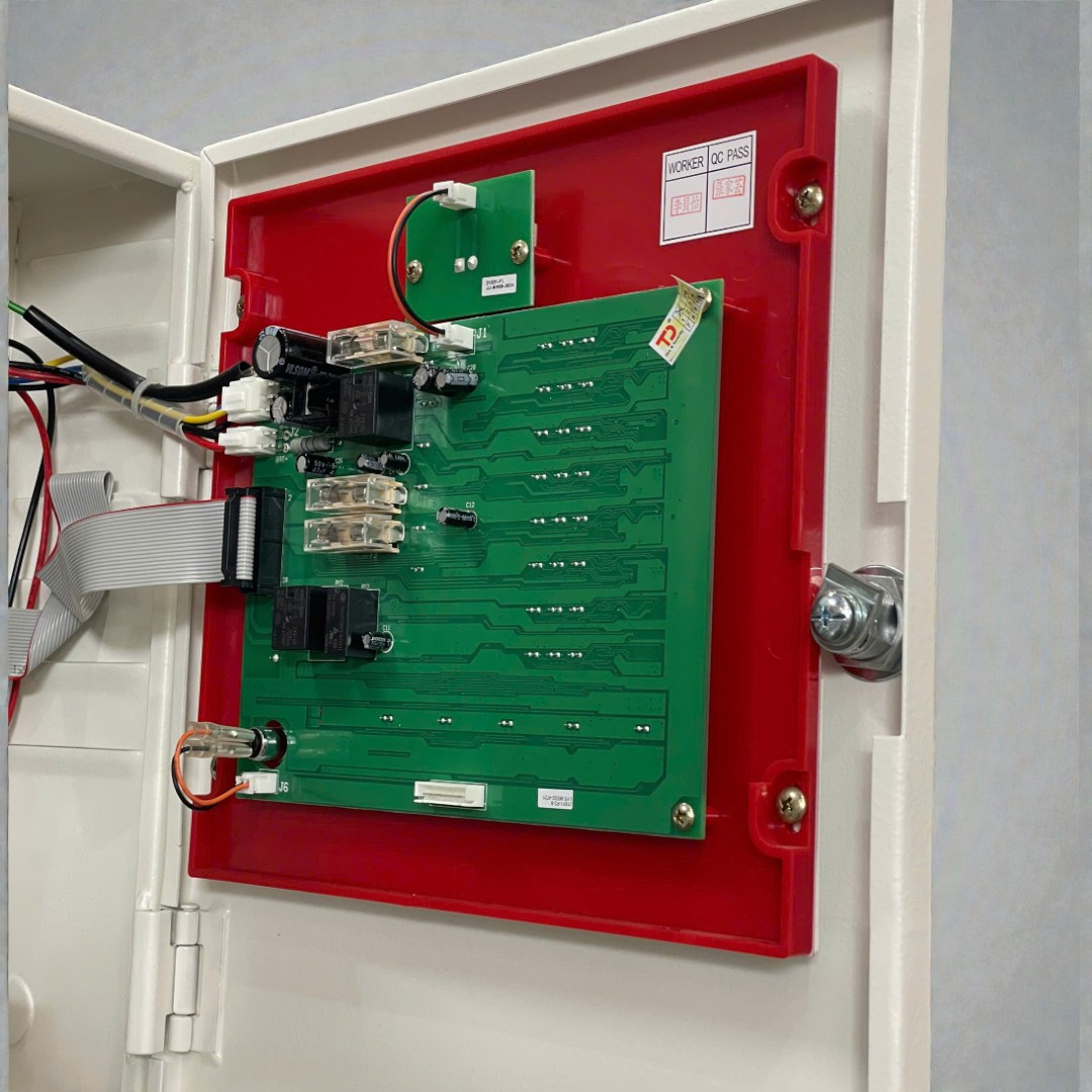 - Cấu tạo thông minh – dễ sử dụng: Tủ được thiết kế dạng treo tường, cấu trúc gọn nhẹ, thẩm mỹ và dễ dàng lắp đặt. Mặt trước gồm bảng điều khiển trực quan, hệ thống đèn LED hiển thị trạng thái, các nút chức năng thao tác rõ ràng, giúp người vận hành dễ dàng giám sát và xử lý khi có sự cố.